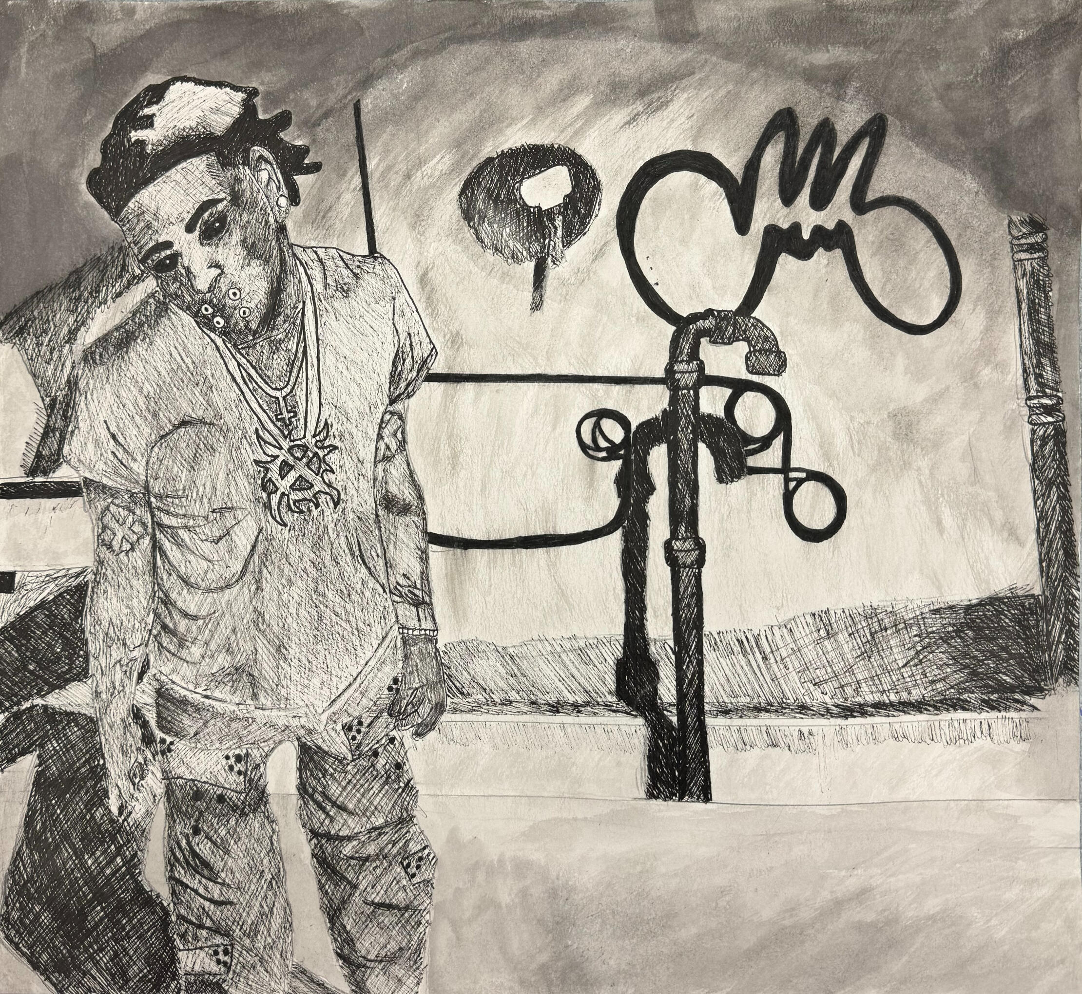 This ink drawing of rapper Ken Carson captures his bold and edgy persona with sharp, dynamic lines and intricate details. The use of ink allows for high contrast, highlighting the intensity of his facial expressions and the texture of his clothing. By focusing on the shadows and contours, the piece reflects the raw energy that Ken Carson brings to his music and performances. The black-and-white medium strips away distractions, drawing attention to his unique style and attitude, making the artwork both visually striking and a reflection of the artist's vision.