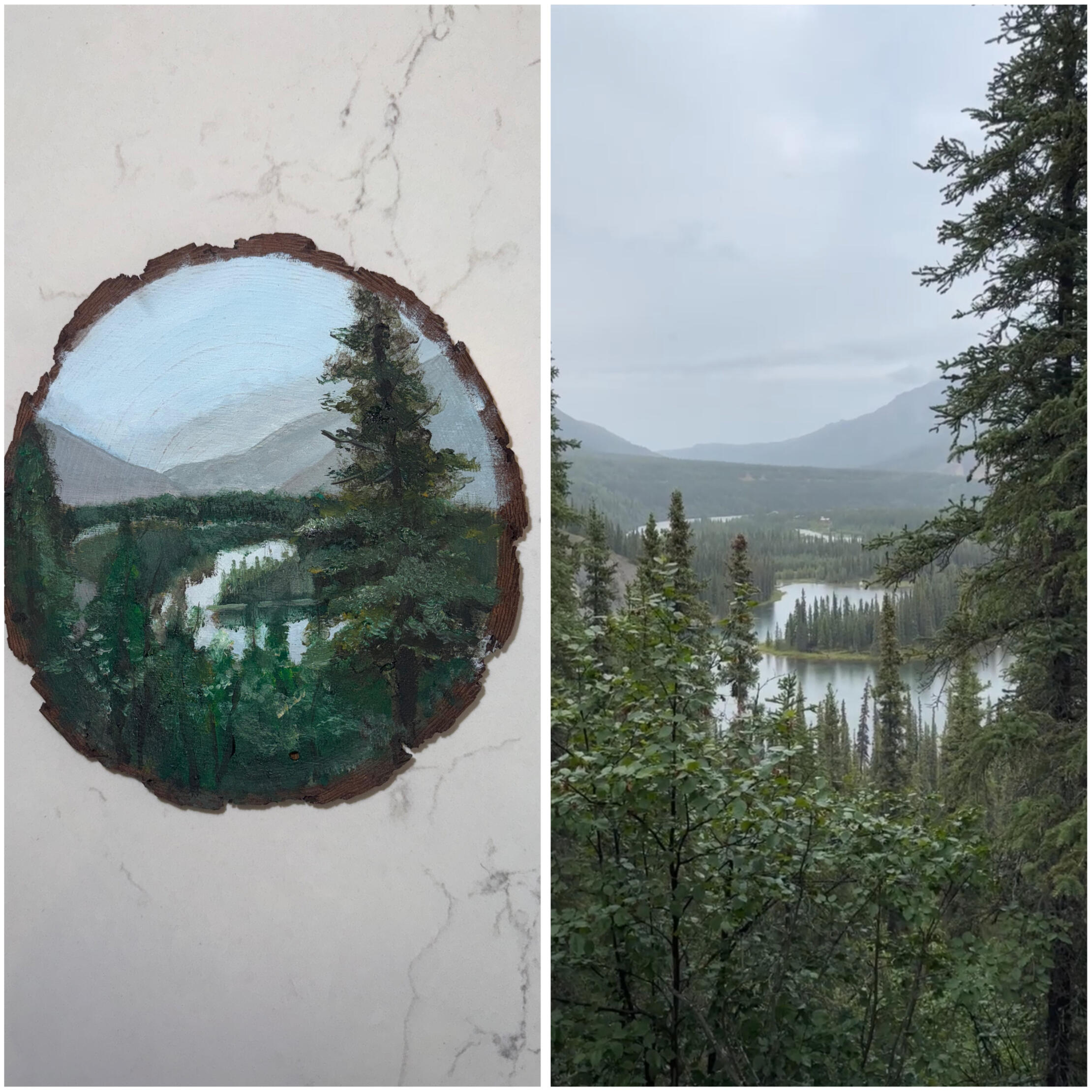 This piece is inspired by a photo I took during a hike in the forests of Alaska, capturing the serene beauty of a river winding through the lush landscape. I painted it using oil paints on a small piece of log, adding an organic element that connects directly to the scene's natural setting. The texture of the wood complements the vivid greens and blues, making this painting not only a visual reflection of the moment but also a tactile reminder of the wilderness that inspired it.